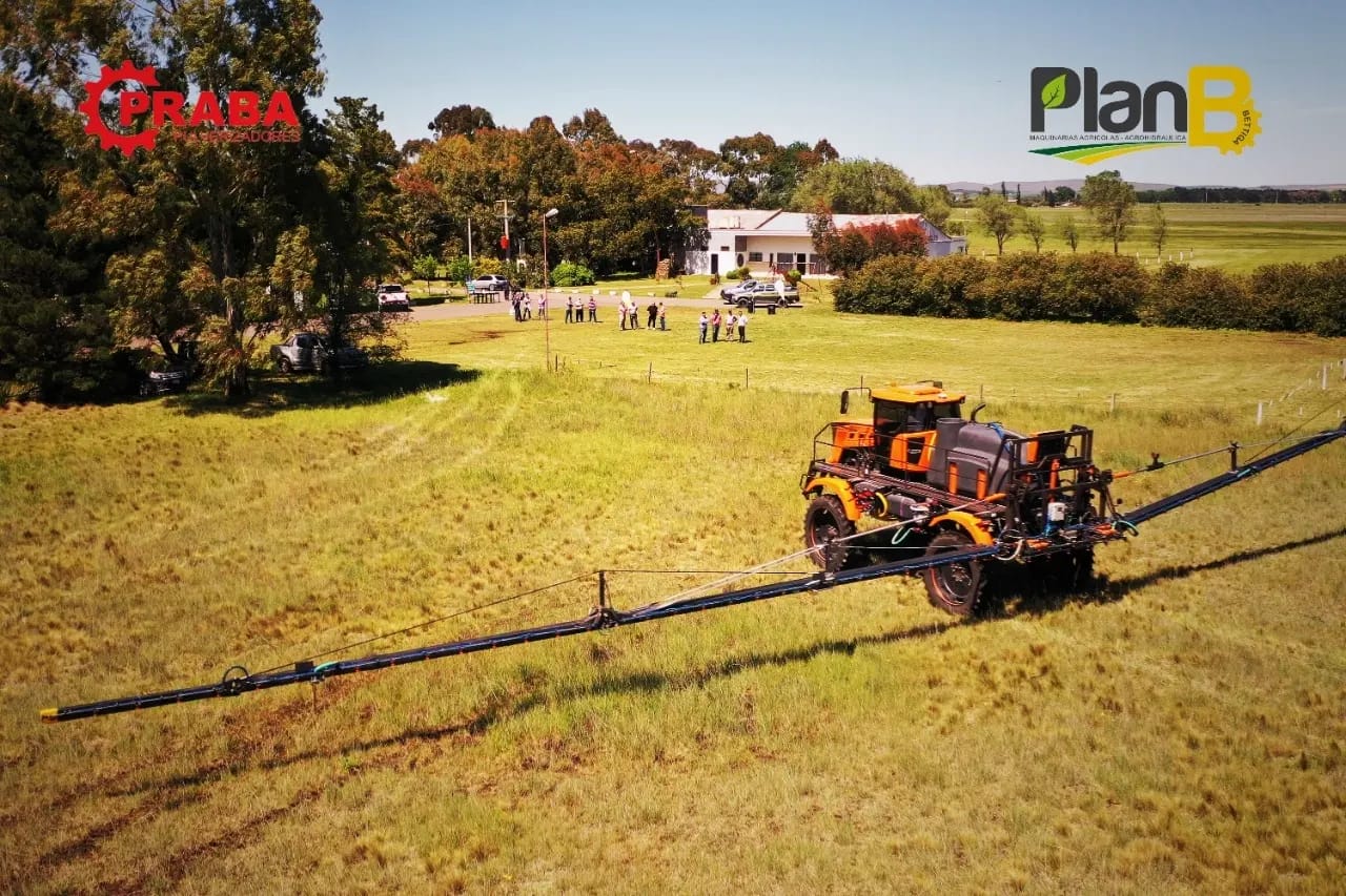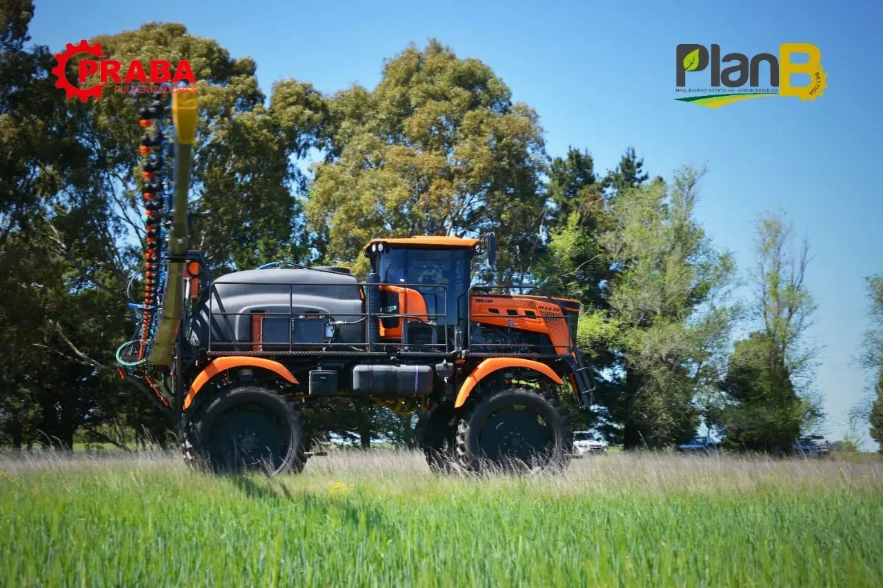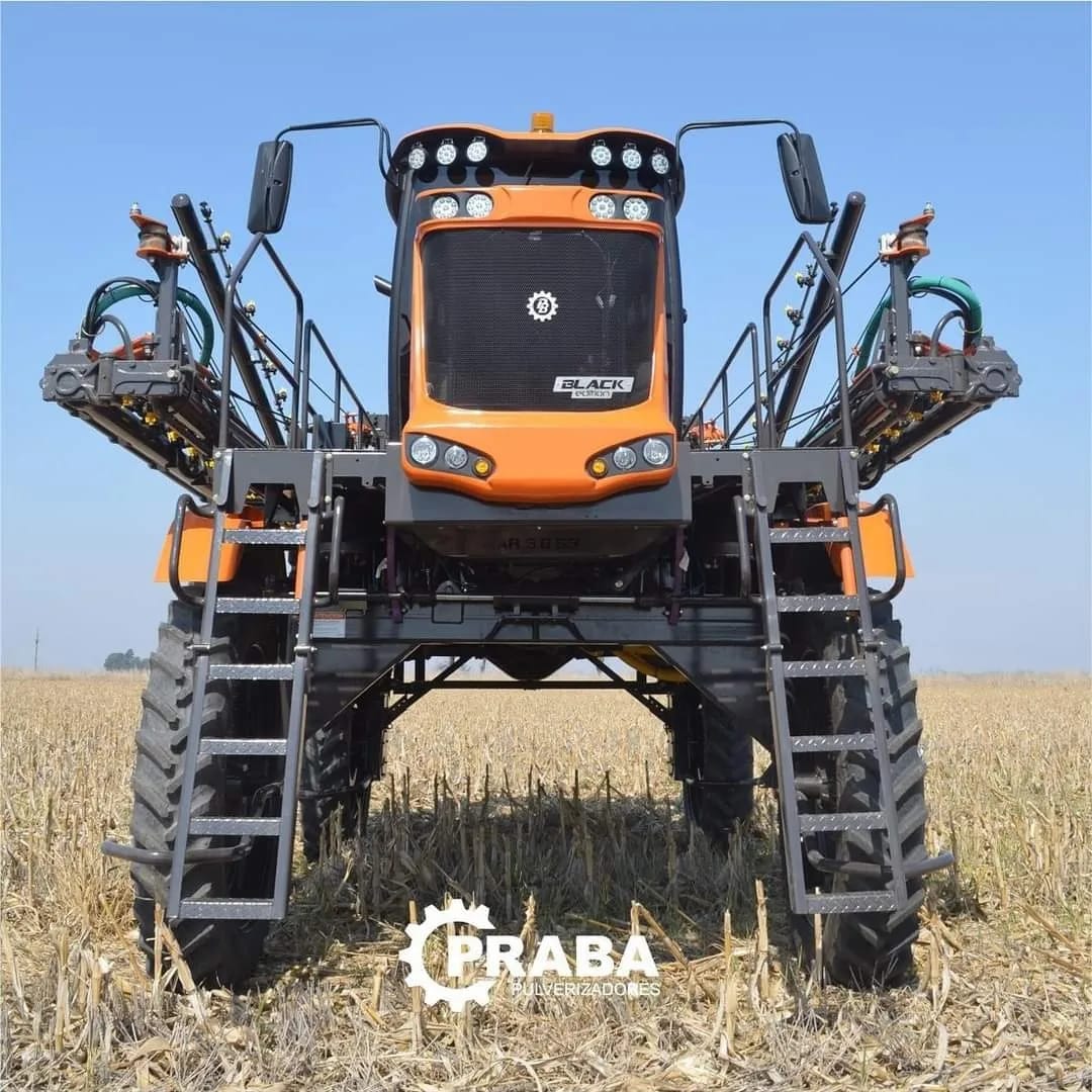 Pulverizadora autopropulsada Praba AR 3.6, con motor delantero de 180 HP, transmisión mecánica, tanque de 3.820 litros y botalón trasero de 36 metros.